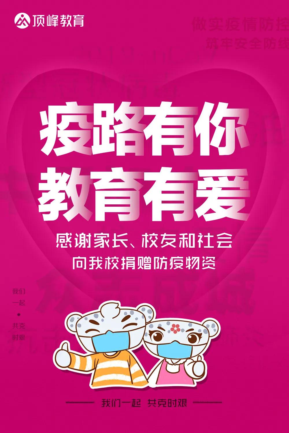 暖風(fēng)習(xí)習(xí),一路同行,在抗擊疫情的關(guān)鍵時(shí)期,這些愛(ài)心義舉不僅是物質(zhì)上的支持,更是精神上的鼓舞。在此,我校誠(chéng)摯感謝關(guān)心和支持學(xué)校工作的社會(huì)各界愛(ài)心人士,我們將秉承這份愛(ài)心與責(zé)任,全力以赴,不負(fù)眾望,嚴(yán)格防控,守護(hù)頂峰師生的健康平安,同時(shí)我們也堅(jiān)信,在社會(huì)各界的真情關(guān)注和大力支持下,一定能夠打贏這場(chǎng)疫情防控阻擊戰(zhàn)。