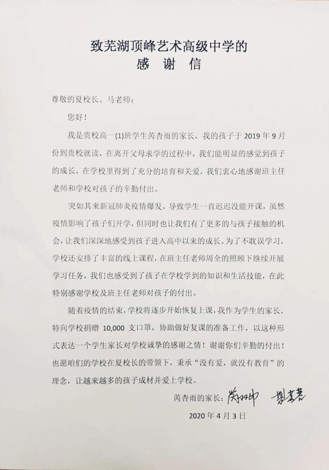 家校同心匯暖流,共筑安全防疫線。為支持學(xué)校疫情防控工作,為學(xué)生返校的安全保障增加物資儲(chǔ)備,頂峰芮杏雨同學(xué)的家長(zhǎng)心系學(xué)校,向?qū)W校捐贈(zèng)一萬(wàn)只一次性醫(yī)用口罩。芮同學(xué)的家長(zhǎng)表示,自疫情發(fā)生以來(lái),學(xué)校一直把同學(xué)們的安全和健康放在第一位,各項(xiàng)疫情防控工作有條不紊地落到實(shí)處,充分彰顯了學(xué)校的擔(dān)當(dāng)。捐贈(zèng)物資,是為學(xué)校當(dāng)前抗疫工作盡一份綿薄之力,也希望借這個(gè)機(jī)會(huì)讓孩子們學(xué)會(huì)感恩,回報(bào)老師們平日的諄諄教誨。我校向家長(zhǎng)們的支持和捐贈(zèng)表示真誠(chéng)的感謝,家長(zhǎng)的愛(ài)心捐贈(zèng)不僅是對(duì)我校師生健康的一份牽掛,對(duì)學(xué)校防疫工作的支持,更進(jìn)一步增強(qiáng)了我校師生打贏疫情防控戰(zhàn)的決心和信心。我校也一定科學(xué)安排,管好用好這些愛(ài)心防疫物資,扎實(shí)落實(shí)各項(xiàng)疫情防控工作,全力為師生安全、有序返校開(kāi)學(xué)做好萬(wàn)無(wú)一失的準(zhǔn)備。在家校同心,守望互助下,也定能營(yíng)造一個(gè)安全、溫馨、美好的校園!